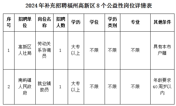 根据福州市人力资源和社会保障局 福州市财政局《关于进一步加大公益性岗位开发力度夯实就业服务基础的通知》(榕人社就〔2022〕15号)、《关于印发<福州市公益性岗位开发与管理办法>的通知》(榕人社就〔2014〕65号)、《关于进一步做好福州市公益性岗位开发管理有关工作的通知》(榕人社就〔2020〕81号)文件精神,实施公益性岗位兜底帮扶就业困难人员、零就业家庭成员、脱贫人口实现就业,经区管委会同意,结合我区乡镇公益性岗位需求,现决定面向全市补充招聘8名公益性岗位工作人员,现将有关事项公告如下: